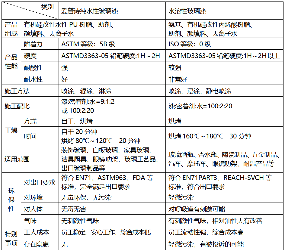 现以属于纯水性玻璃漆的爱普诗水性玻璃漆为例,同其他水溶性玻璃漆,从产品成份、性能、适用范围等多方面,进行对比说明如下: